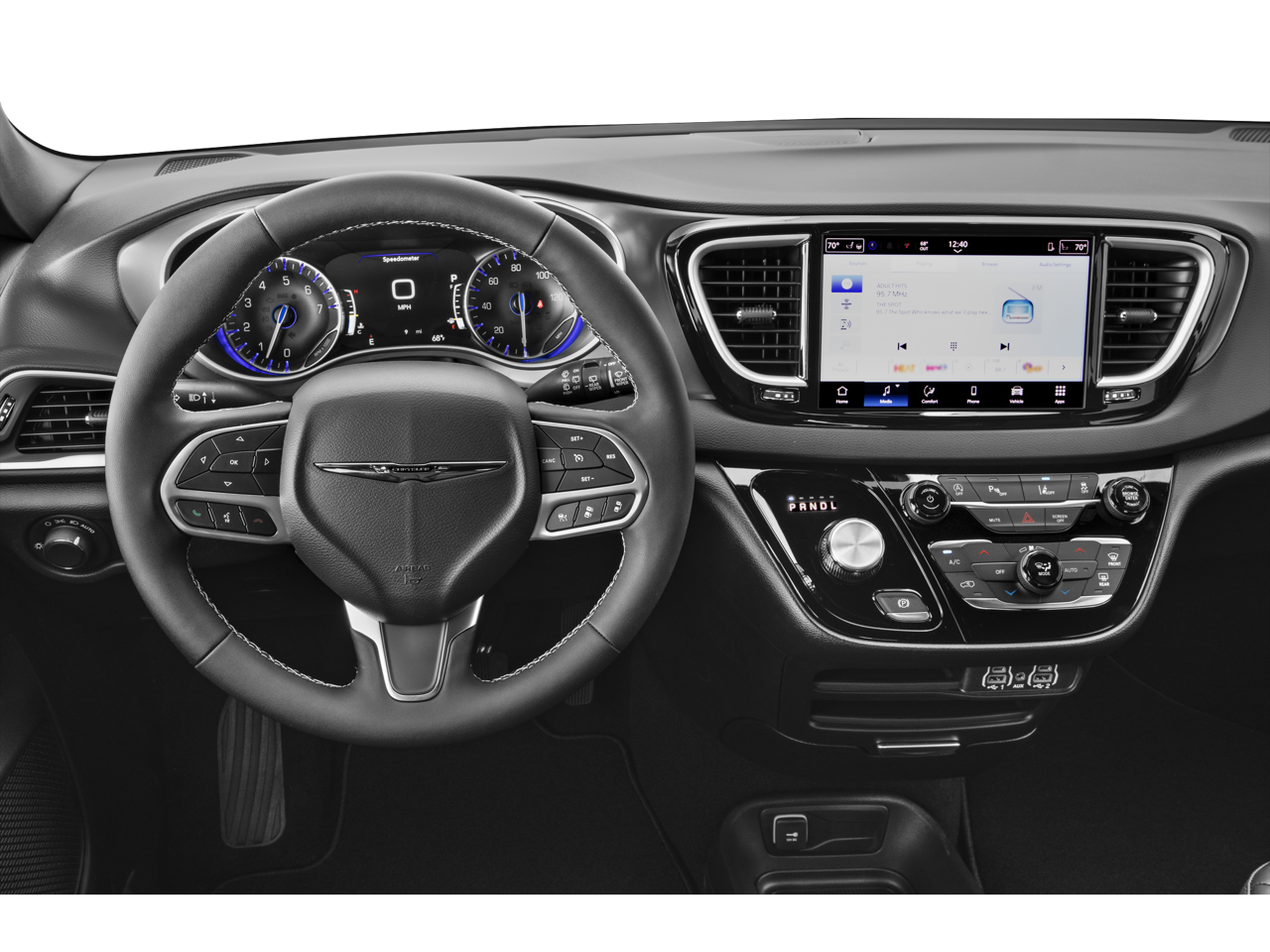 Quick Order Package 27E, 17 x 7 Aluminum Wheels, 3.25 Axle Ratio, 3rd row seats: split-bench, 4-Wheel Disc Brakes, 6 Speakers, ABS brakes, Air Conditioning, Alloy wheels, AM/FM radio: SiriusXM, Apple CarPlay/Android Auto, Automatic temperature control, Black Seats, Brake assist, Bumpers: body-color, Caprice Leatherette Bucket Seats, Compass, Delay-off headlights, Driver door bin, Driver vanity mirror, Driver's Seat Mounted Armrest, Dual front impact airbags, Dual front side impact airbags, Electronic Stability Control, Emergency communication system: Chrysler Connect, Four wheel independent suspension, Front anti-roll bar, Front Bucket Seats, Front dual zone A/C, Front reading lights, Fully automatic headlights, Heated door mirrors, Heated front seats, Heated steering wheel, Illuminated entry, Knee airbag, Low tire pressure warning, Occupant sensing airbag, Outside temperature display, Overhead airbag, Overhead console, Panic alarm, ParkView Rear Back-Up Camera, Passenger door bin, Passenger seat mounted armrest, Passenger vanity mirror, Power door mirrors, Power driver seat, Power Liftgate, Power steering, Power windows, Radio data system, Radio: Uconnect 5 w/10.1 Display, Rain sensing wipers, Rear air conditioning, Rear window defroster, Rear window wiper, Reclining 3rd row seat, Remote keyless entry, Security system, Speed control, Split folding rear seat, Spoiler, Steering wheel mounted audio controls, Tachometer, Telescoping steering wheel, Tilt steering wheel, Touring Suspension, Traction control, Trip computer, Turn signal indicator mirrors, Variably intermittent wipers, and Voltmeter.