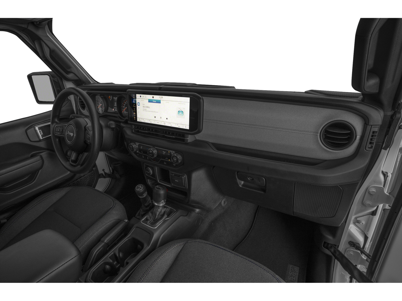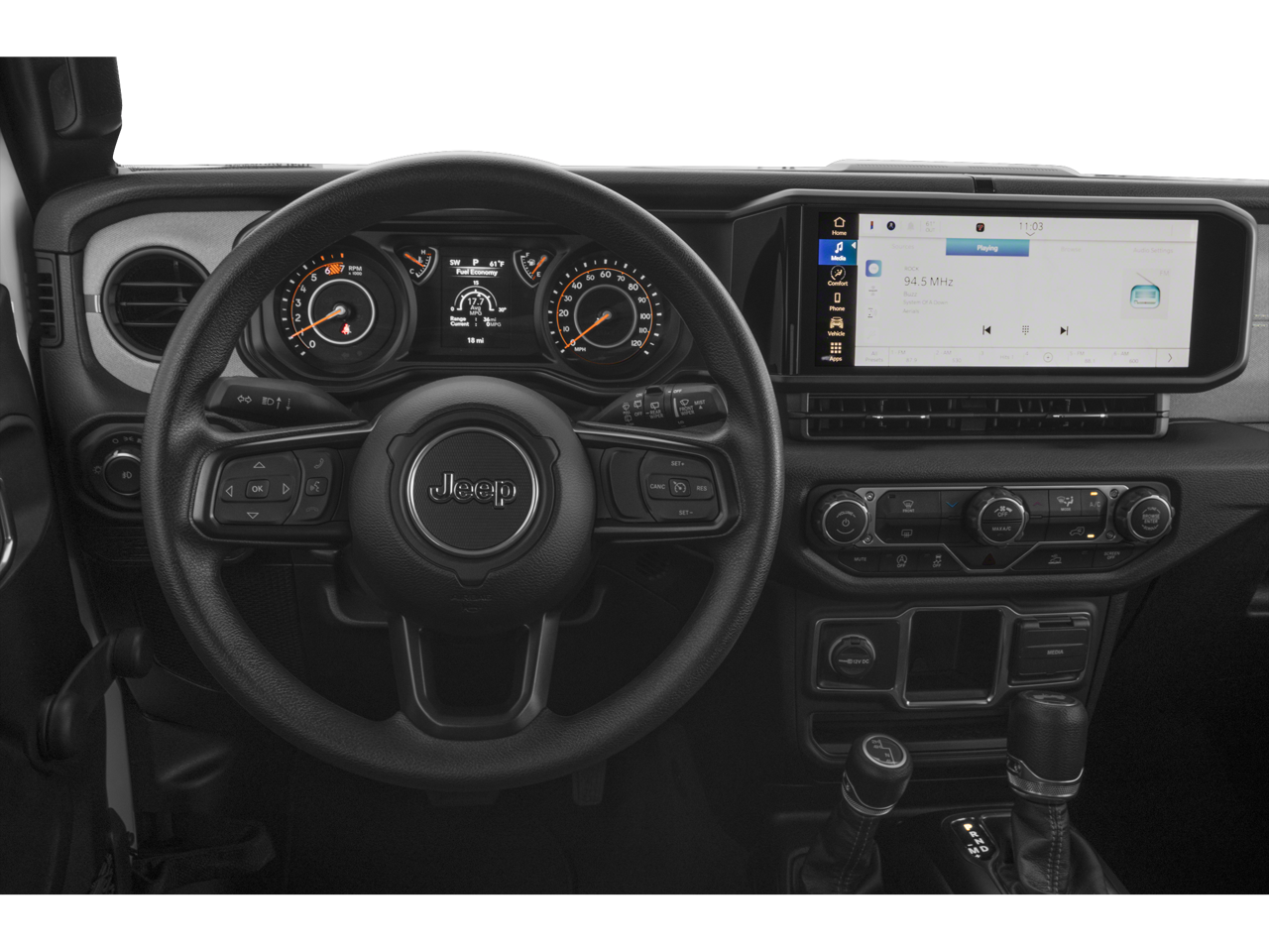 110 MPH Vehicle Max Speed Calibration, 3.45 Overall Top Gear Ratio, 4-Wheel Disc Brakes, 8 Speakers, ABS brakes, Air Conditioning, AM/FM radio: SiriusXM, Apple CarPlay/Android Auto, Aux Battery, Brake assist, Cloth Low-Back Bucket Seats, Compass, Delay-off headlights, Driver door bin, Driver vanity mirror, Dual front impact airbags, Dual front side impact airbags, Electronic Stability Control, Front anti-roll bar, Front Bucket Seats, Front Center Armrest w/Storage, Front fog lights, Front reading lights, Illuminated entry, Integrated roll-over protection, Low tire pressure warning, Non-Lock Fuel Cap w/o Discriminator, Normal Duty Suspension, Occupant sensing airbag, Outside temperature display, Overhead airbag, Panic alarm, ParkView Rear Back-Up Camera, Passenger door bin, Passenger vanity mirror, Power steering, Power windows, Quick Order Package 23B Sport, Radio data system, Radio: Uconnect 5 w/12.3 Display, Rear anti-roll bar, Rear reading lights, Remote keyless entry, Speed control, Steering wheel mounted audio controls, Stop-Start Dual Battery System, Tachometer, Telescoping steering wheel, Tilt steering wheel, Traction control, Trip computer, Variably intermittent wipers, Wheels: 17 x 7.5 Black Steel Styled.